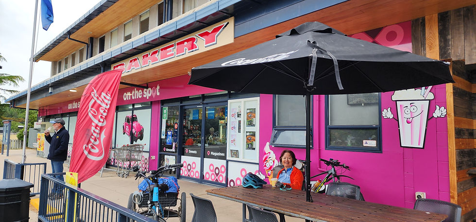 Outside we find a recumbent tricycle rider! He is from Alaska, heading west, opposite to us, so the closure does not affect him. He seems keen to promote recumbent bikes and tires to sell his recumbent to Sau Keng. She is not interested - not now anyway, later she may try one from Brian of Trikes NZ.