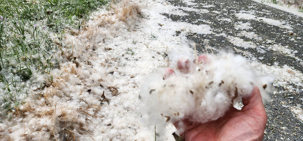 It looks like there is snow underneath the tree ahead. Not possible of course... it's a cottonwood tree, I don't think I have seen one with so much 'cotton' beneath it before.